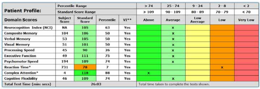 The assessment chart displayed on this page provides a visual summary of your child's scores across multiple cognitive domains, including: